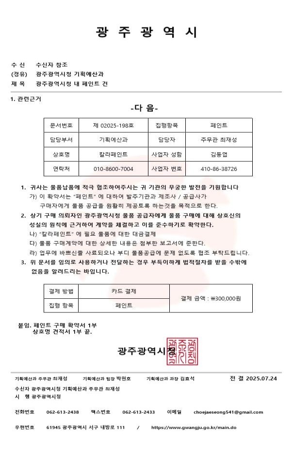 광주시 관계자는 “공무원이 민간업체에 일방적으로 연락해 계약을 체결하거나 물품을 요구하는 일은 절대 없다”며 “의심스러운 상황이 발생하면 해당 기관에 직접 확인하고 피해를 입었을 경우 즉시 경찰 등에 신고해 달라”고 당부했다.