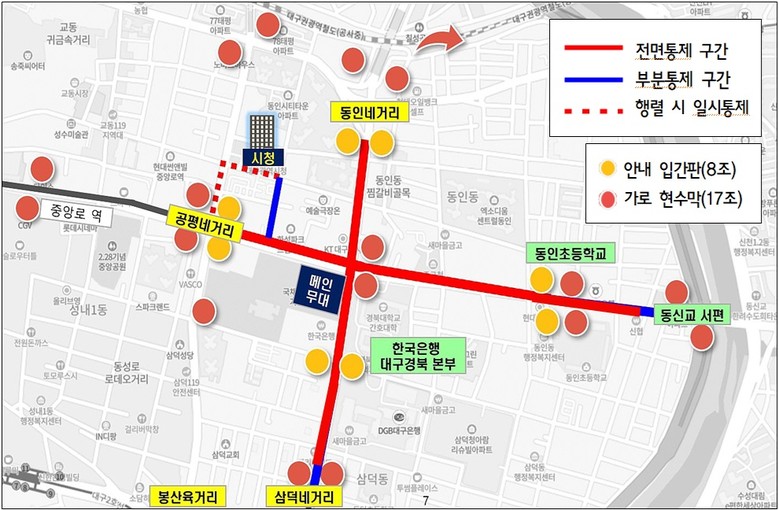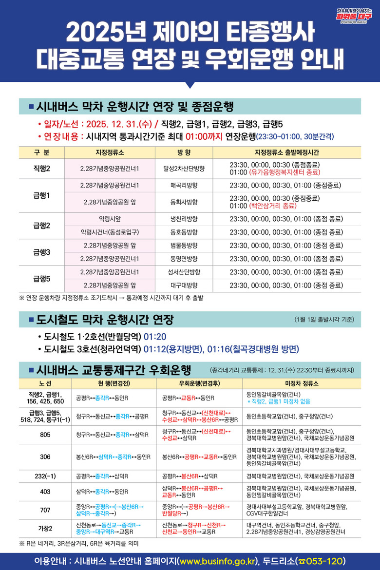 한편, 행사 당일 밤 10시 30분부터 다음날 01시 30까지 동인네거리~삼덕네거리, 공평네거리~동신교 서편 구간이 전면 통제된다. 행사장 인근을 통과하는 시내버스 18개 노선*은 밤 10시 30분 이후 행사장을 우회 운행하고, 직행 1개 노선과 급행 4개 노선**은 새벽 1시경 시내를 통과한다. 도시철도는 반월당역과 명덕역을 다음날 01시 10분경 통과하도록 연장 운행해 시민들의 안전한 귀가를 도울 계획이다.