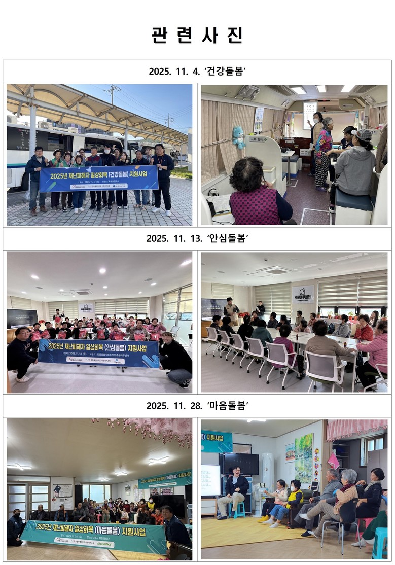 「일상 회복 지원사업」은 재난 이후 회복 단계에 필요한 지원을 제공하기 위한 프로그램으로, ‘건강돌봄’, ‘안심돌봄’, ‘마음돌봄’의 세 분야로 추진하였다. 각 사업은 공공·민간기관이 함께 참여해 ‘현장 중심 재난복지’ 모델을 실천한다는 점에서 의미가 크다.