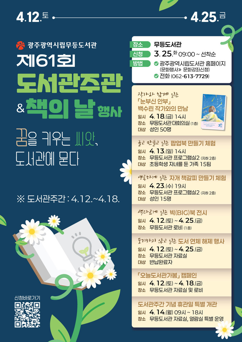 송경희 광주시립도서관장은 “도서관주간 동안 시민들이 책에 한 발짝 더 다가가고 나아가 책 읽기를 생활화 하기를 바란다”며 “한강 작가의 노벨상 수상 소식으로부터 시작된 ‘책 읽는 광주’의 열기가 광주시민의 마음을 오래도록 따뜻하게 만들어 주는 하나의 상징이 되기를 바란다”고 말했다.