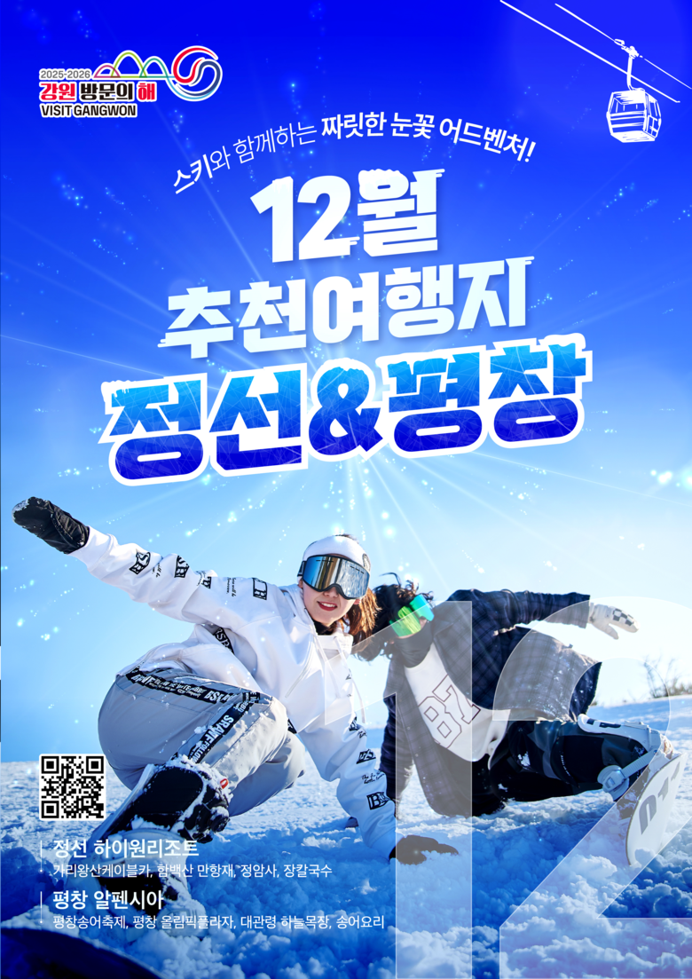 - 정선 하이원리조트, 평창 알펜시아 - [강원도 세계타임즈=김민석 기자] 강원특별자치도와 강원관광재단은 ‘2025-2026 강원 방문의 해’ 12월 추천 여행지로 정선군과 평창군을 선정하여 대대적인 홍보마케팅을 추진한다고 밝혔다. 12월에는 스키 개장 시즌에 맞춰 정선의 ‘하이원리조트’와 평창의 ‘알펜시아’를 집중적으로 홍보할 예정이다.
