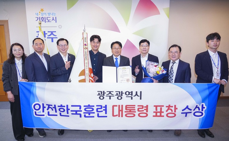 [광주 세계타임즈=손권일 기자] 강기정 광주광역시장이 27일 시청 접견실에서 '2024 재난대응 안전한국훈련' 평가에서 전국 시·도 중 1위를 차지, 대통령 기관표창을 수상한 배복환 시민안전실장 등 직원들과 기념촬영을 하고 있다./광주광역시 제공
