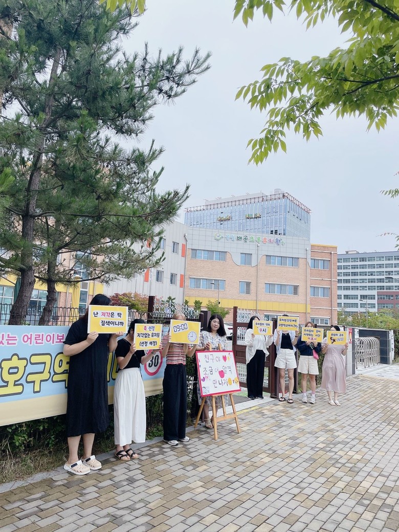 캠페인 시작에 앞서 유아들과 유치원 등원 시간을 지키는 것의 중요성과 그 이유에 대해 함께 이야기를 나누고, ‘친구야, 9시에 만나자!’를 표어로 정해 정성스레 포스터와 피켓을 만들었다.
