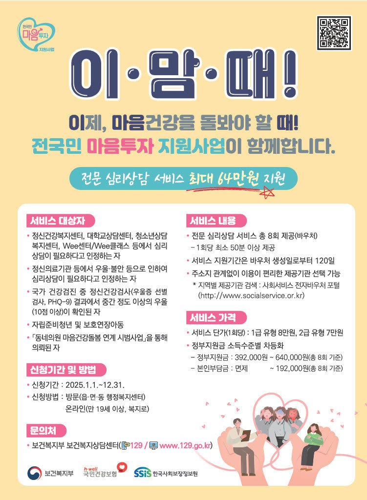 배강숙 건강위생과장은 “이번 제공기관 기준 완화로 정서적 어려움이 있는 시민들의 서비스 접근성이 높아져 마음건강 회복에 도움이 되길 바란다”며 “사업의 질을 높이기 위해 사업 모니터링과 제공기관 현장점검도 꼼꼼히 하겠다”고 밝혔다.