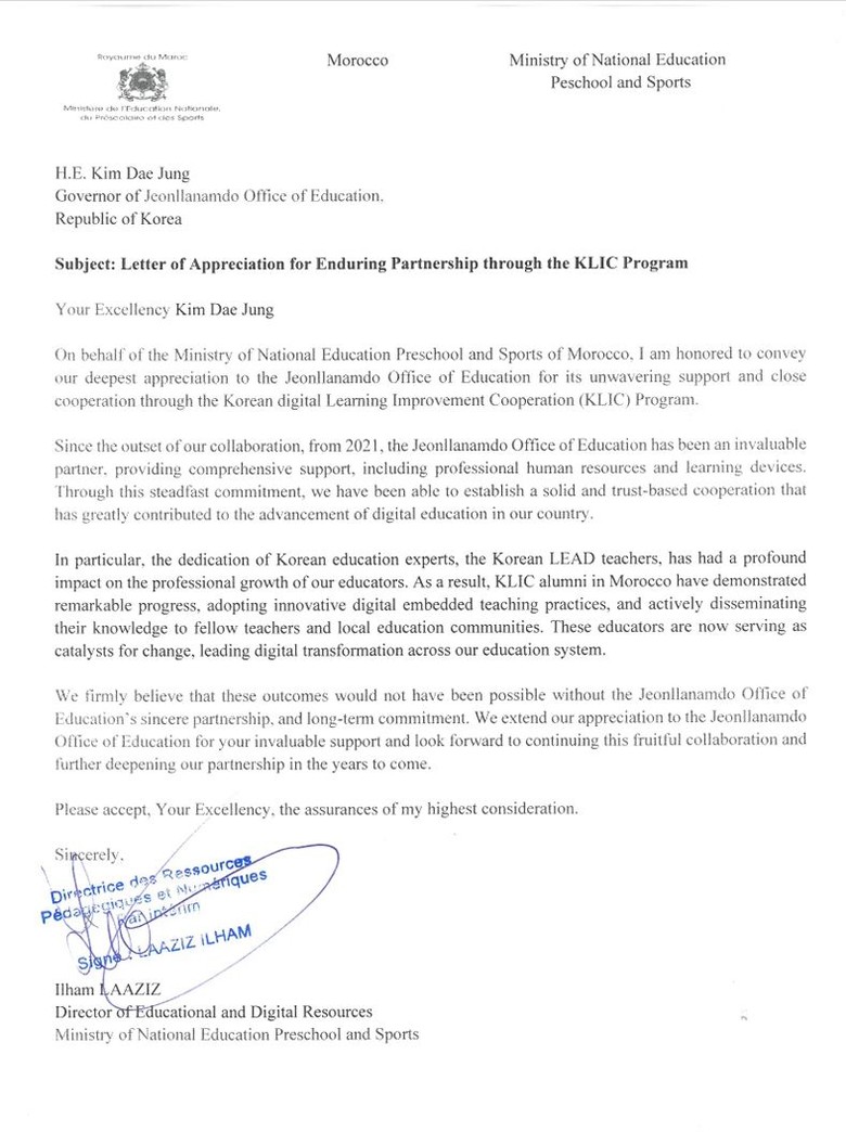 이번 감사 서한은 전라남도교육청이 2021년부터 교육 정보화 지원 사업 (KLIC‧Korean Digital-Learning Improvement Cooperation)을 통해 모로코 교육부와 디지털 교육 분야에서 지속적인 협력을 이어온 데 대한 평가를 담고 있다. 모로코 교육부는 서한을 통해 전남교육청이 단기적 지원을 넘어 장기적 관점에서 협력을 이어온 점에 깊은 감사를 표했다.