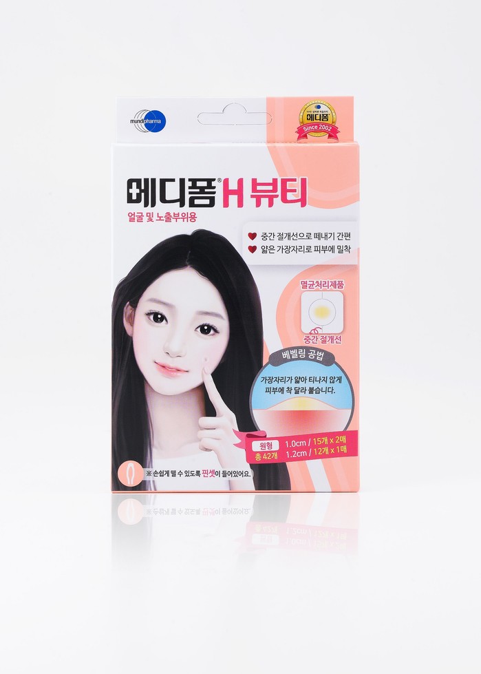 메디폼® H뷰티는 직경 1cm와 1.2cm의 원형 두 종류로 작은 패치를 손쉽게 떼어낼 수 있도록 필름 중간에 절개선을 삽입했다. 또한 패키지에 핀셋이 동봉되어 있어서 손 대지 않고 떼어낼 수 있어 손으로 인한 오염을 감소할 수 있고, 전 제품은 파우치 포장 후 멸균 처리해 소비자가 위생적으로 사용할 수 있도록 했다.