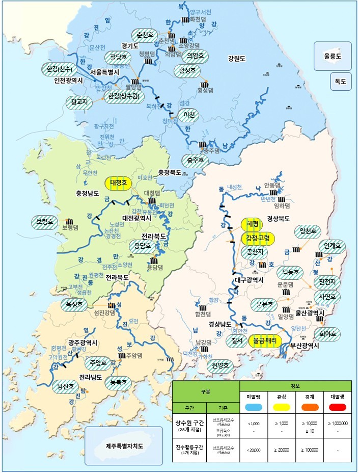 | ▲ 조류경보제 지점도 및 경보발령 현황(8.7 기준) |