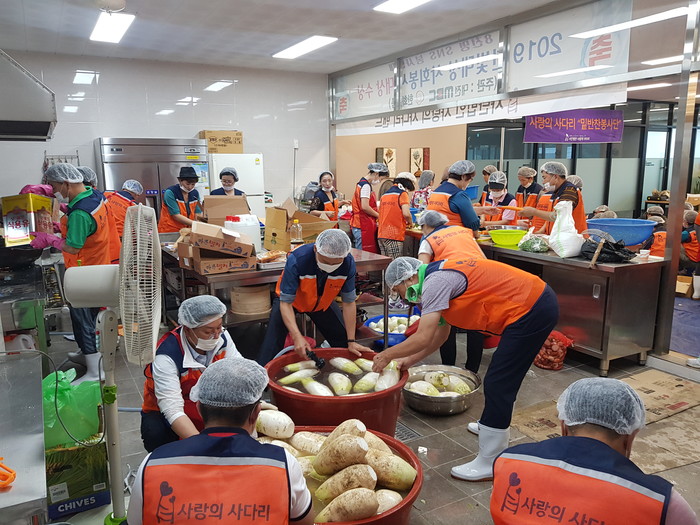 이날 밑반찬 봉사는 멸치꽈리고추볶음, 깍두기, 계란말이 3가지를 자원봉사자 100명이 정성을 다해서 만들고 배달을 하였다.