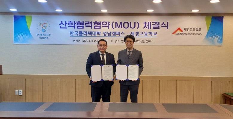 [파주시 세계타임즈=송민수 기자] 세경고등학교(교장 장계홍)는 지난 4월 23일 한국폴리텍대학 성남캠퍼스(학장 김종진)와 취업 및 교육훈련 등의 지원·협력을 위한 업무협약(MOU)을 체결하였다. 이번 업무협약을 통해 반도체 교육자원 교류 및 다양한 협력사업을 추진하고, 상호 신뢰와 우호적 협력관계를 구축하였다.
