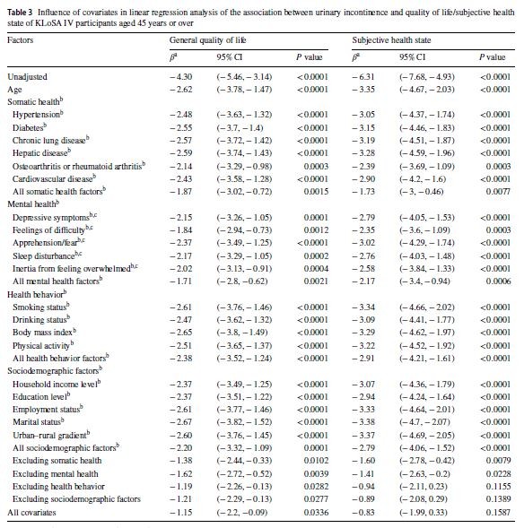 삶의 질에 있어 연령을 보정한 후 회귀계수 값은 -2.62이었으며, 이는 요실금이 삶의 질에 악영향을 미친다는 것을 시사함과 동시에, 혼란변수 보정에서 영향력의 크기를 비교하는 기준으로 쓰였다. 즉 신체적 건강, 정신적 건강 등을 넣고 보정했을 때 회귀계수 값이 변화한다면, 변화하는 절대값만큼 각 혼란변수들이 영향력 있게 작용했음을 의미한다.