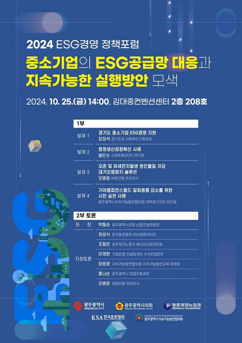 이어 박필순 광주시의회 산업건설위원장을 좌장으로 홍나순 광주시 창업진흥과장, 권성식 한국표준협회 이에스지(ESG)경영센터장, 이재현 기업은행 수석 컨설턴트, 조동민 광주테크노파크 에너지산업센터장, 장윤경 지속가능발전협의회 지속가능발전교육위원장, 오병윤 ㈜첨단랩 이사가 토론자로 나서 중소기업의 이에스지(ESG) 공급망 대응과 지원방안 등에 대해 다양한 의견과 심도 있는 논의가 이뤄질 예정이다.