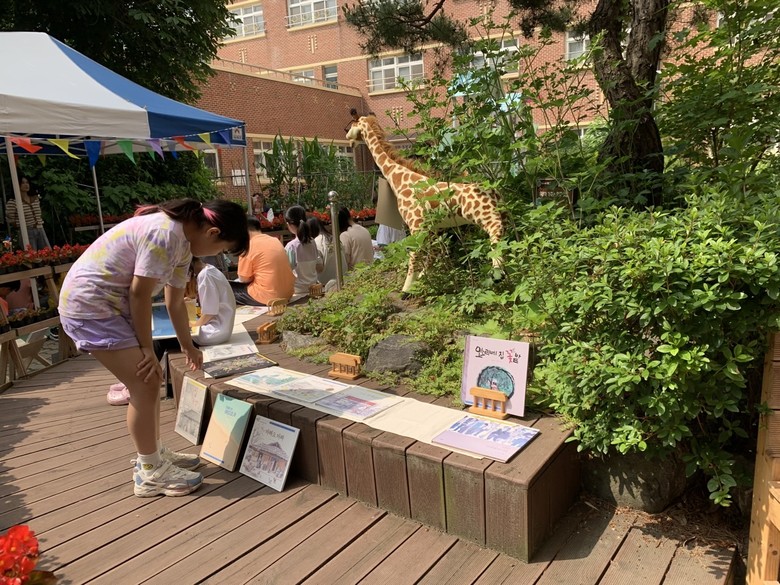 어린이 도서 연구회에서 지원받은 한국 그림책 106권이 학교 숲 정원에 전시되었다.