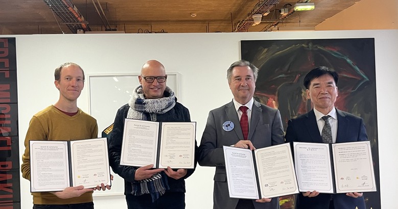 | ▲ (왼쪽부터) 국립아트센터 아쉬 뒤 세즈, 프락 피카르디, 프락 그랑라주 관계자와 조일교 충남도 문화체육관광국장이 프랑스에서 현지시각 5일 업무협약을 체결했다. |
