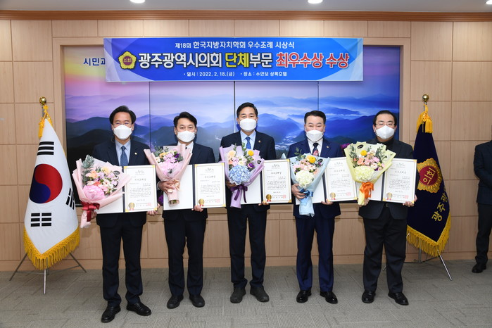 [광주=세계타임즈 손권일 기자] 광주광역시의회(의장 김용집)는 지난 18일, 충주 수안보 상록호텔에서 열린 한국지방자치학회서 주관하는「제18회 지방의회 우수조례」시상식에서 단체부문 ‘최우수상’과 개인부문 ‘대상’ 및 ‘우수상(4명)’ 을 각각 수상하였다.