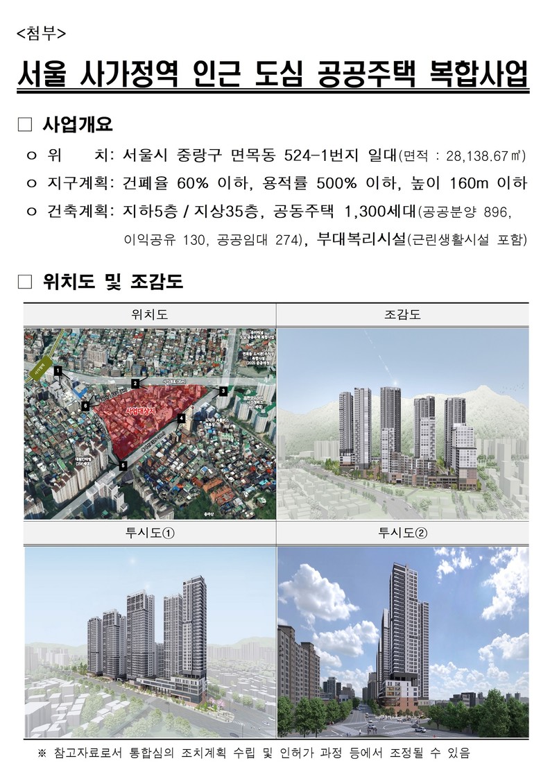 서울시는 1월 27일(화) 제1차 공공주택통합심의위원회를 열어 중랑구 면목동 524-1번지 일대 ‘사가정역 인근 도심 공공주택 복합사업계획(안)’을 ‘조건부 가결’ 처리했다고 밝혔다.
