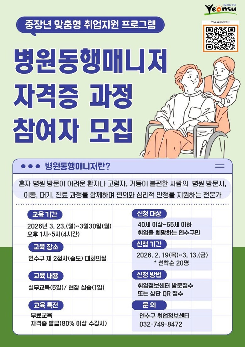 교육·자격 취득·현장 면접까지 원스톱… 40~65세 구민 20명 모집 [연수구 세계타임즈=심하린 기자] 연수구(구청장 이재호)는 고령화 사회에 대응하고 중장년층의 경력 전환을 지원하기 위해 직무교육, 현장실습, 자격증 취득, 취업 연계를 원스톱으로 지원하는 ‘병원동행매니저 자격증 과정’을 운영한다.