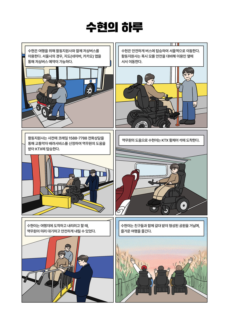 이해를 돕기 위해 휠체어 이동, 신변처리 방법 등 그림으로 10건, 보조기기 실제 이용 사례 웹툰 5건, 장애인콜택시, 저상버스 이용 방법 등 사례 2건을 삽화로 제작하여 삽입하였다.