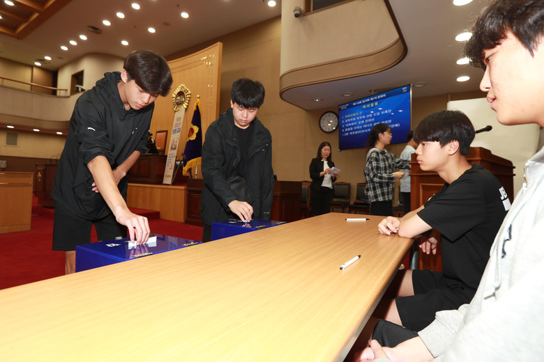 이날 학생들은 무기명 투표로 의장을 선출한 뒤, ‘교복 착용 의무화 조례안’과 ‘사복 데이 운영 건의안’, ‘보이는 라디오 상설 건의안’ 등 3건의 안건을 상정해 찬반 토론과 전자투표를 진행했다.