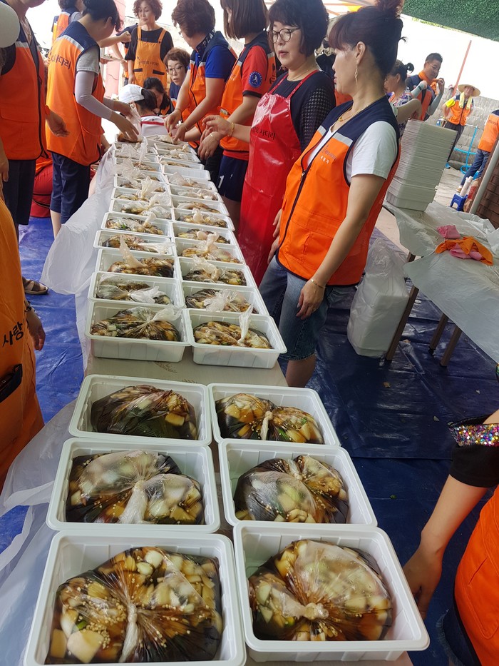 이날 사랑의 밑반찬은 고추장돼지고기볶음, 뽕잎양파초절임 2가지를 폭염의 날씨에도 정성을 다해서 만들고 배달까지 마무리하였다.