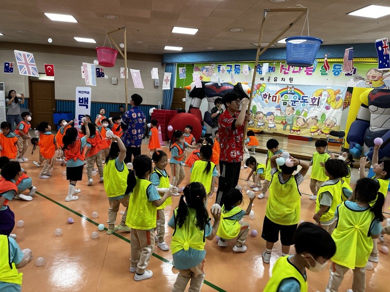 5월 7일(화)~5월 9일(목)은 연령별 한마음 운동회를 개최하였다. 태극기와 오륜기가 휘날리는 강당에 씩씩하게 입장하여 준비체조를 하고 선서문 낭독 후 원장선생님의 개회 선언으로 시작이 되었다. 개인 달리기, 색판 뒤집기, 볼풀공 서바이벌, 바람 잡는 특공대, 에펠탑 쌓기, 택배왔어요, 릴레이 경주 등 유아와 교사가 함께 하는 다양한 게임으로 구성되었으며 모두 한마음이 되어 서로를 응원하였다. 유아, 교사들이 함께 웃고 즐길 수 있는 시간으로 환호성과 웃음소리가 끊이지 않았으며 팀이 하나가 되어 안전하고 협력하는 배움과 성장이 있는 시간이었다.
