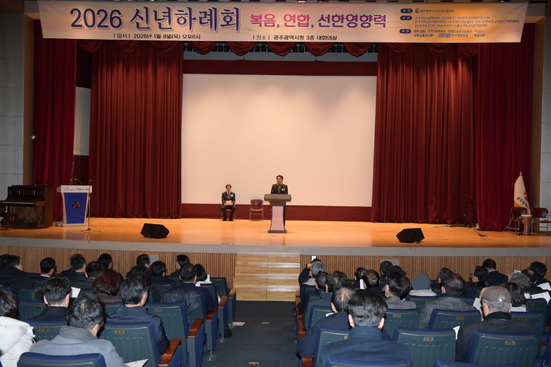 [광주 세계타임즈=손권일 기자] 강기정 광주광역시장이 지난 8일 오후 시청 대회의실에서 열린 광주기독교교단협의회 신년하례회에 참석해 신년사를 하고 있다./ 광주광역시 제공