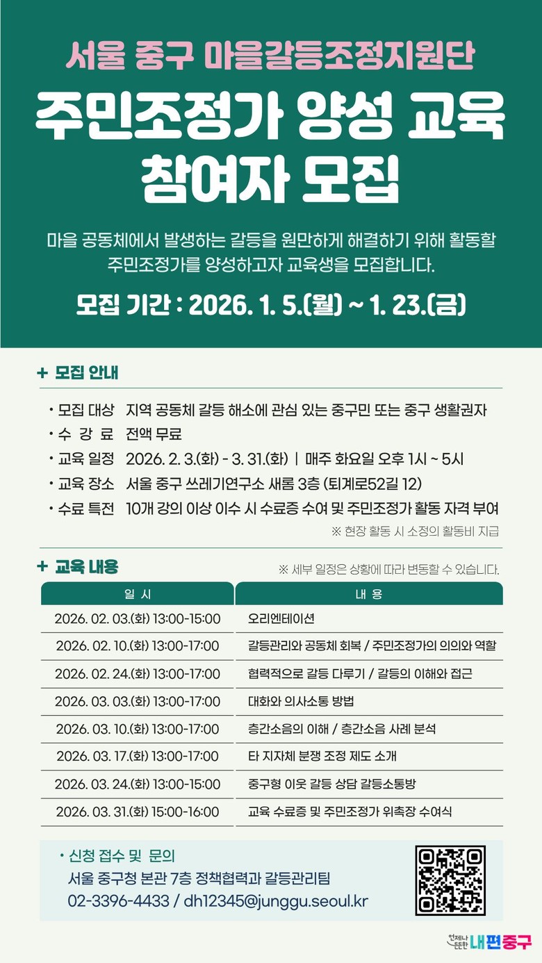모집 대상은 지역 현안과 갈등 해결에 관심 있는 중구 주민 또는 중구 생활권자로, 교육 수료 후 주민조정가로서 활동이 가능한 주민이다. 모집 인원은 20명 내외이며, 모집 기간은 이번 달 23일까지다.