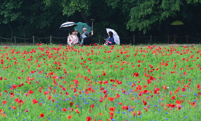 12일 경남 함양군 함양읍 상림경관단지에서 봄비를 머금고 활짝 핀 양귀비꽃을 감상하며 걷고 있다.