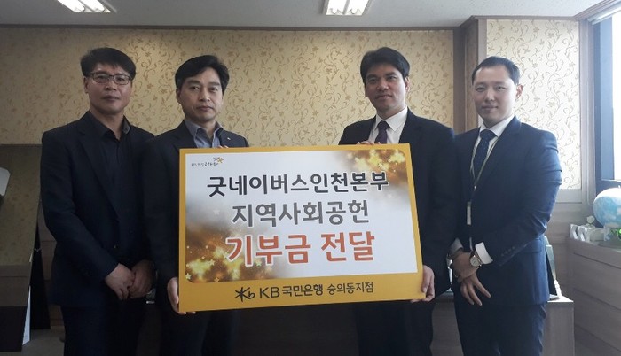 KB국민은행 숭의동지점은 지속적으로 지역사회의 어려운 이웃들을 위한 사회공헌활동을 진행하고 있으며 굿네이버스 인천본부에 전달한 이번 기금은 지역사회에서 경제적으로 어려움을 겪고 있는 저소득가정 아이들에게 장학금으로 지원 될 예정이다.