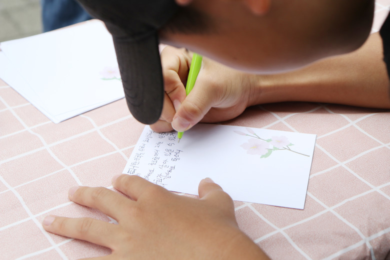 | ▲ 신천지자원봉사단 김포지부가 지난 19일 오전 장기역 시계탑광장에서 ‘호국보훈 캠페인’을 진행한 가운데 한 학생이 국가유공자에게 편지를 쓰고 있다. [사진 제공 = 신천지자원봉사단 김포지부] |