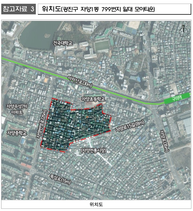 대상지는 자양전통시장과 자양초등학교 인근에 위치하며, 노후·불량 건축물 비율 73%로 노후도가 높아 주거환경 개선이 필요한 곳이다.