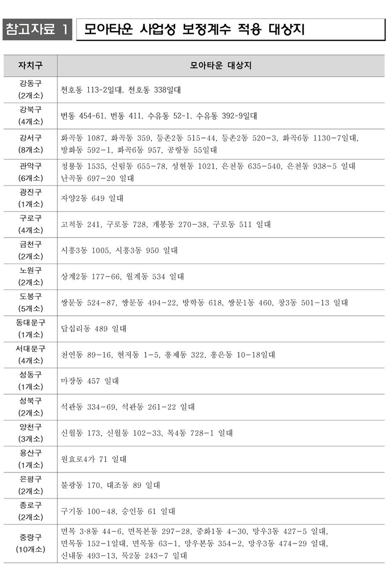 서울시는 모아타운뿐 아니라, 모아타운 외에서 서울시 모아주택 심의를 통과한 가로주택정비사업 8개소에도 보정계수를 적용하여 조합원 부담 감소를 통해 사업성이 개선될 것으로 보인다.