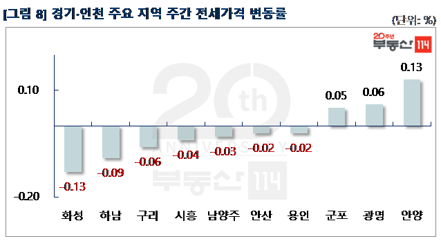 신도시는 ▼산본(-0.08%) ▼동탄(-0.04%) ▼일산(-0.03%) ▼분당(-0.01%) 순으로 떨어졌다. 산본은 송정지구 2,000여 가구 입주가 전 지역에 영향을 미치면서 산본동 한라주공4단지가 500만원 하락했다. 동탄은 능동 푸른마을포스코더샵2차가 1,500만원 내렸고, 일산은 주엽동 문촌16단지뉴삼익, 강선14단지두산이 각각 500만원씩 떨어졌다. 분당은 비수기를 맞아 거래가 정체되면서 서현동 시범한양과 효자임광이 250만원-1,000만원 하락했다. 반면 △평촌(0.03%) △광교(0.02%)는 올랐다.