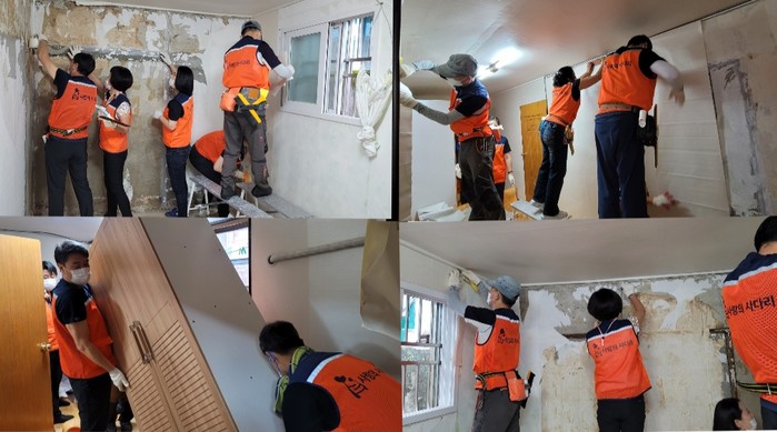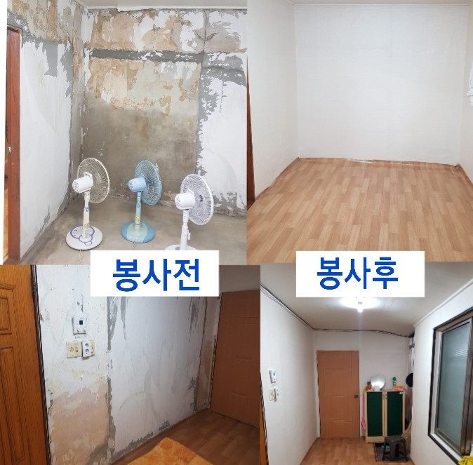 이날 봉사는 장인들 도배학원 김정자 원장을 비롯해서 자원봉사자 12명이 큰방 2개, 주방, 거실 등 폭우로 훼손된 가정에서 도배교체 봉사를 하였다.