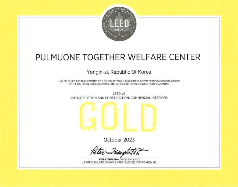풀무원투게더가 받은 LEED 골드는 LEED 신축건물 인증 가운데 가장 최신 버전인 V4에서 플래티넘에 이어 두 번째로 높은 등급이다. LEED는 1998년에 미국 그린빌딩위원회에 의해 처음 도입되어, 현재는 전 세계적으로 가장 널리 사용되고 있는 친환경 건축물 인증제도다. 풀무원에선 2020년 풀무원기술원이 국내 식품연구소 최초로 LEED V4 골드등급을 받은 바 있다.