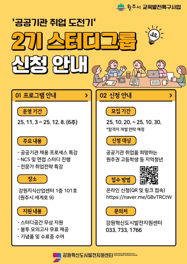 강원혁신도시발전지원센터 장유진 센터장은 “이번 스터디그룹은 단순한 취업 준비를 넘어 청년들이 스스로 학습하고 성장할 수 있는 참여형 프로그램으로 운영되고 있다”며, “앞으로도 지역 청년들의 공공기관 진출을 위해 실질적이고 체계적인 지원을 이어가겠다”고 밝혔다.