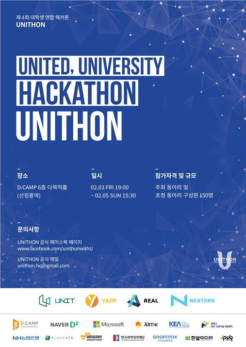 UNITHON은 2월 3일부터 5일까지 선정릉역 은행권청년창업재단 D.CAMP에서 진행되는 행사로, 대학생(Univ) 또는 연합(United)을 의미하는 'UNI’와 해커톤(Hackathon)을 합성한 신조어로 ‘대학생들이 함께 만들어가는 해커톤’을 의미한다.
