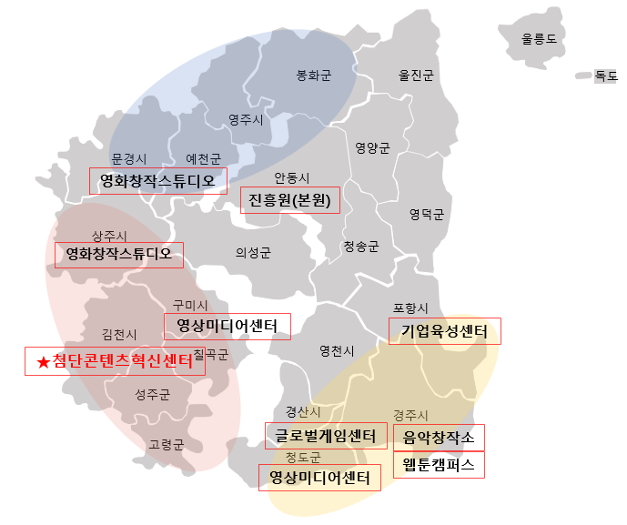 이런 가운데 도는 2013년 1인 창조기업지원센터(안동, 창업) 및 2016년 콘텐츠코리아랩(안동, 창업) 조성에 이어, 2021년에는 음악창작소, 웹툰캠퍼스(경주, 창작), 콘텐츠기업지원센터(포항, 기업육성) 등을 연이어 개소하는 등 지역에서 성장한 기업이 수도권 등 타 지역으로 떠나지 않고 도내에 머무를 수 있는 인프라를 꾸준히 구축해 나가고 있다.