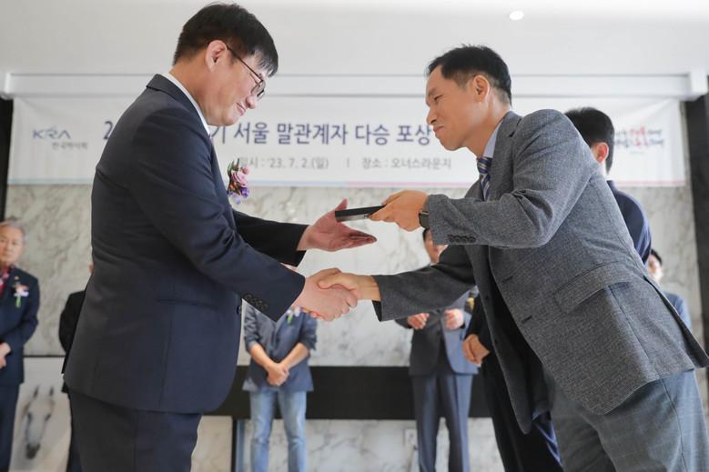 두 번째 수상의 주인공은 최상식 조교사(28조)였다. 만 30년간 서울경마장의 조교사로 활약한 최상식 조교사는 올해 6월 11일 경주마 ‘쏘아라투투’의 우승으로 개인 통산 500승을 기록했다. 최 조교사는 이날 행사장에서 다승달성 시상과 은퇴 기념식을 동시에 맞이했다. 통산 여덟 번의 대상경주 우승과 500승을 뒤로하고 은퇴를 맞은 최 조교사는 “팬들의 사랑 덕분에 기수로 10년, 조교사로 30년을 아름답게 마무리하고 이 자리에 설 수 있어 기쁘다”며 은퇴 소감을 밝혔다.