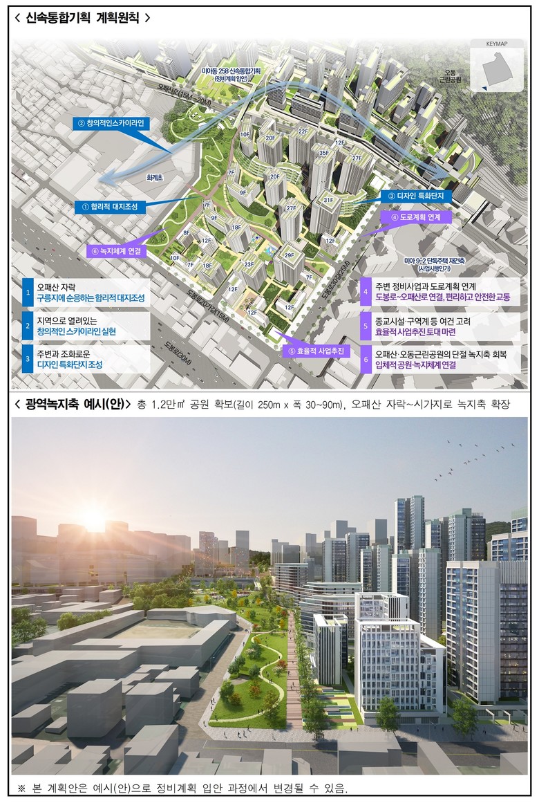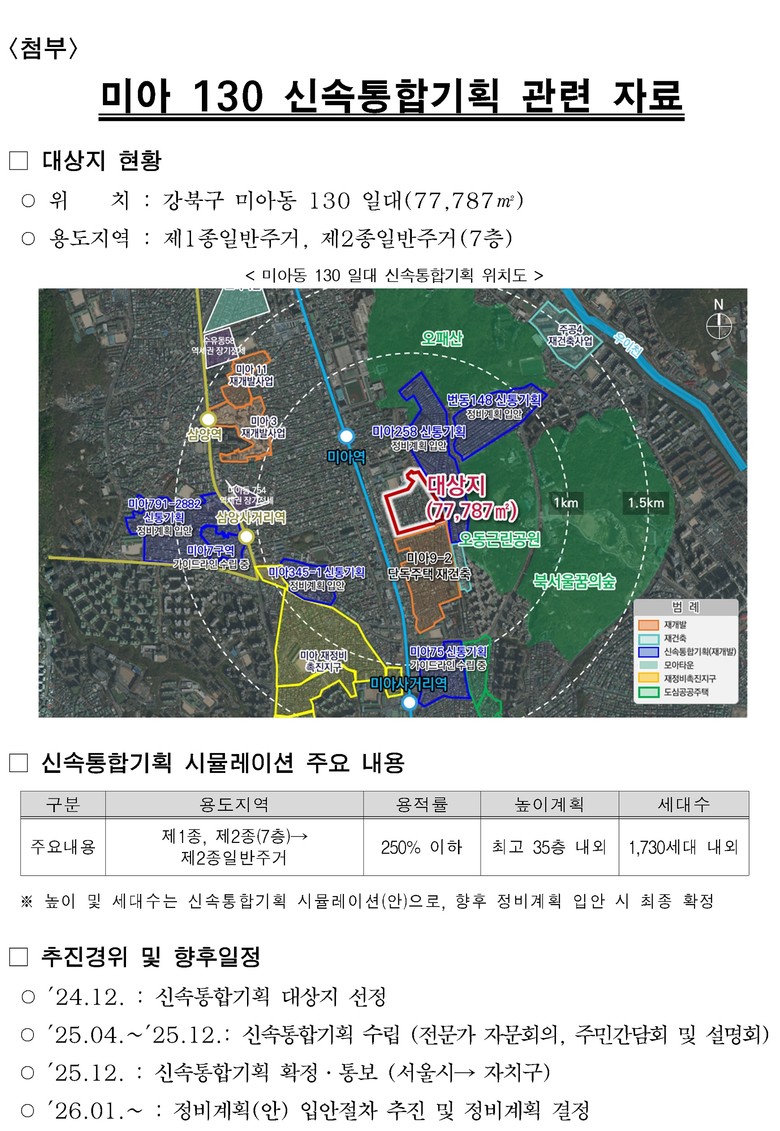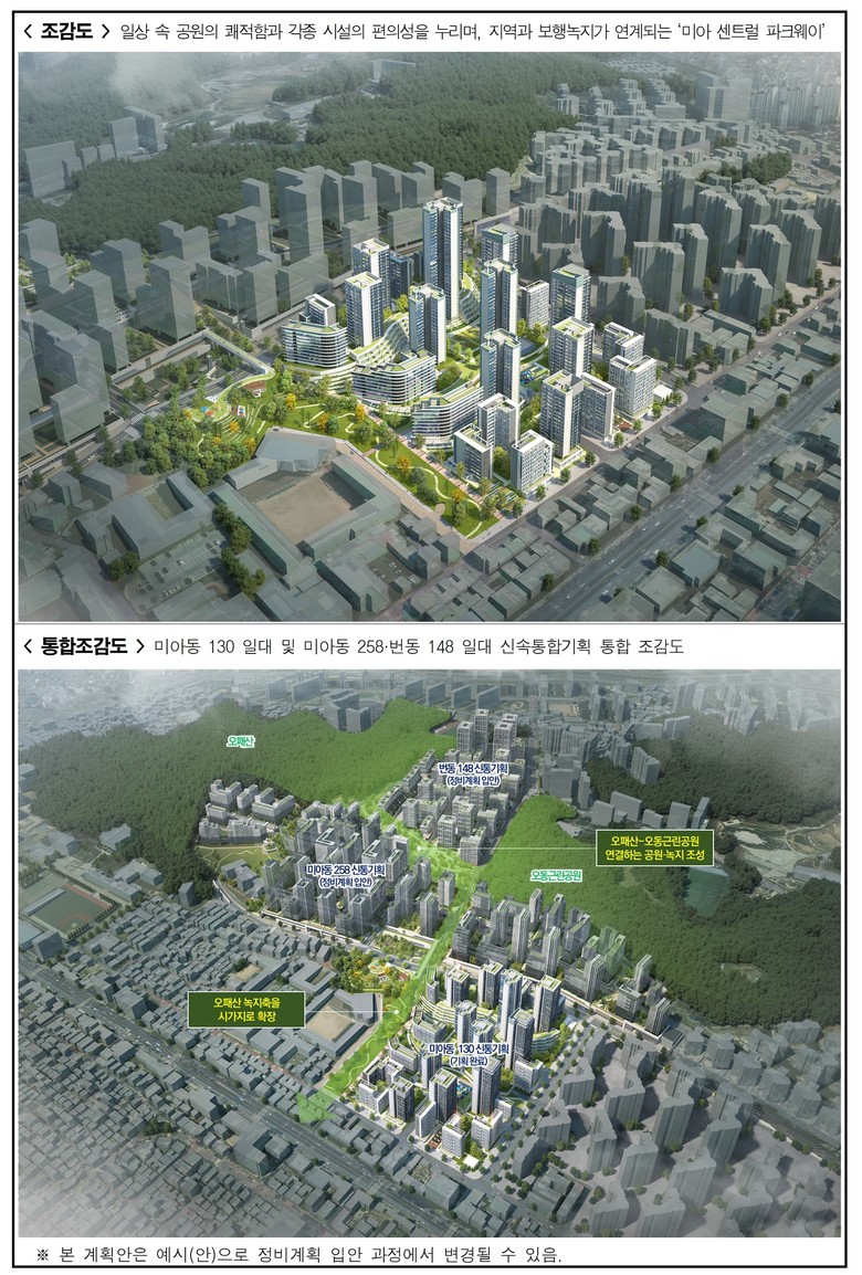 이번 신속통합기획은 과거 주택단지 중심 개발로 시가지와 단절됐던 오패산 녹지축을 미아역(도봉로) 일대까지 확장하고, 입체공원 도입과 사업성 보정계수(1.8) 적용을 통해 총 1,730세대, 최고 35층 규모의 쾌적하고 안전한 주거단지를 조성하는 것이 핵심이다.