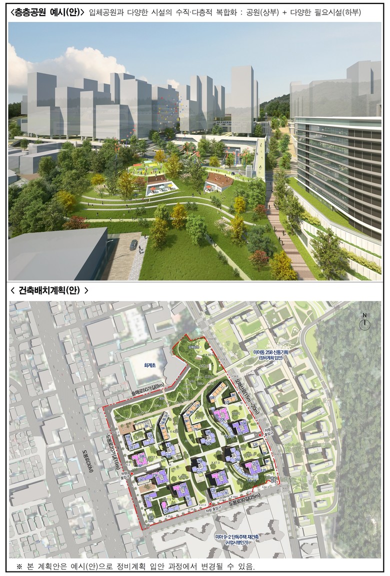 주요 내용은 ▴입체적 공원 조성을 통한 시가지로의 녹지축 확장 ▴국공유지 효율적 재배치 및 유연한 도시계획으로 사업실현성 증대 ▴지역을 연결하고 단절을 해소하는 통합적 도로 정비 ▴초등학교 일조를 고려한 높이 및 안전한 통학로 확보 등 초품아 단지 실현이다.