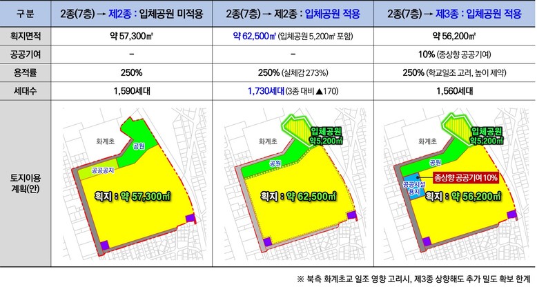 특히 공원 일부를 입체공원으로 조성해 입체공원 면적만큼 아파트 획지가 늘어나며, 이를 통해 용도지역 상향 없이도 실체감 용적률과 세대수가 증가되는 효과로 나타난다.