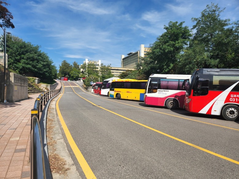 특히 관광버스·화물트럭은 물론 중장비들이 주간에는 물론 밤샘 주차하면서 학생들의 안전을 위협하고 있다.