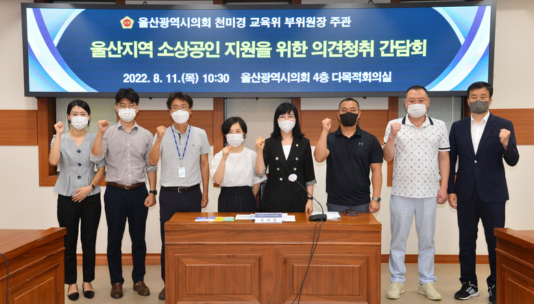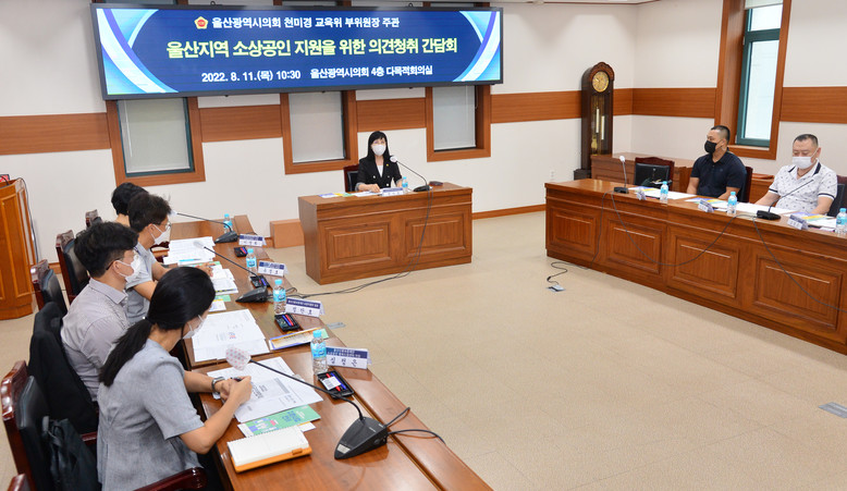 [울산 세계타임즈=이호근 기자] 울산광역시의회 교육위원회 천미경 부위원장은 11일 오전 10시 30분 4층 다목적회의실에서 울산지역 소상공인연합회와 울산신용보증재단 행복드림센터 및 시청 중소벤처기업과 관계자가 참석한 가운데 ‘울산지역 소상공인 지원 방안’에 대한 의견청취 간담회를 가졌다.