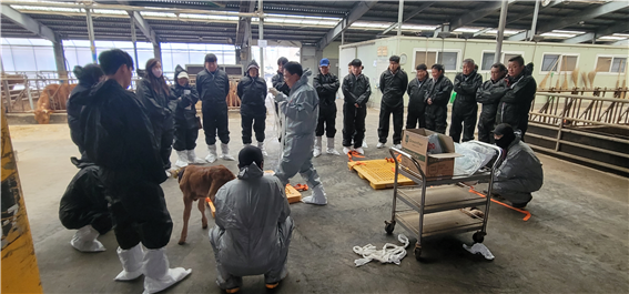 | ▲ 교육생들이 송아지 응급상황 대응 요령에 대한 현장 시연 교육을 받고 있다. |