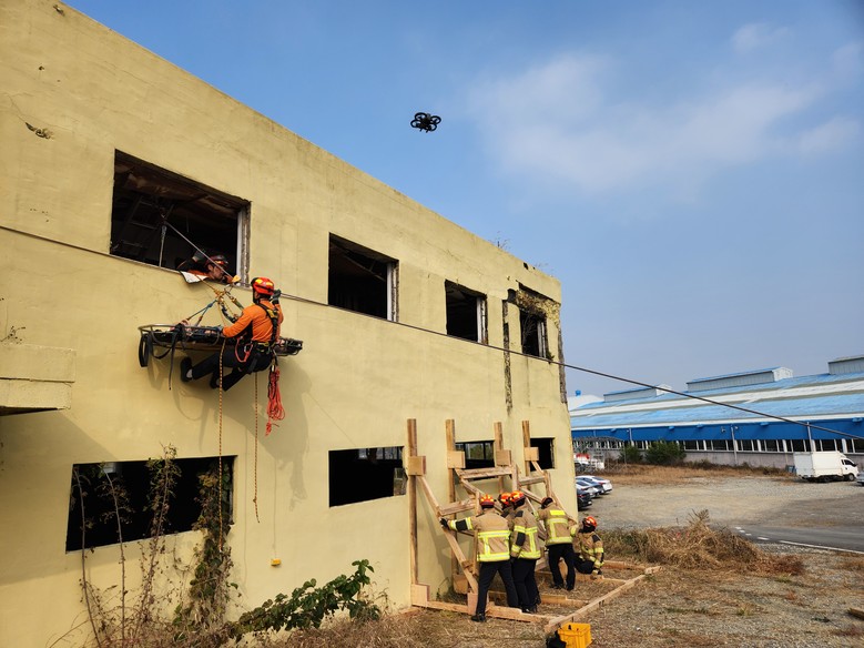 이날 훈련한 주요 내용은 △드론을 활용한 구조 대상자 위치 탐색 △2차 붕괴를 방지하기 위한 목재 지지대 설치 등 구조물 안정화 △퇴로가 차단된 상황에서 로프 시스템을 이용한 들것 구조 등 복합 구조 전술이다.