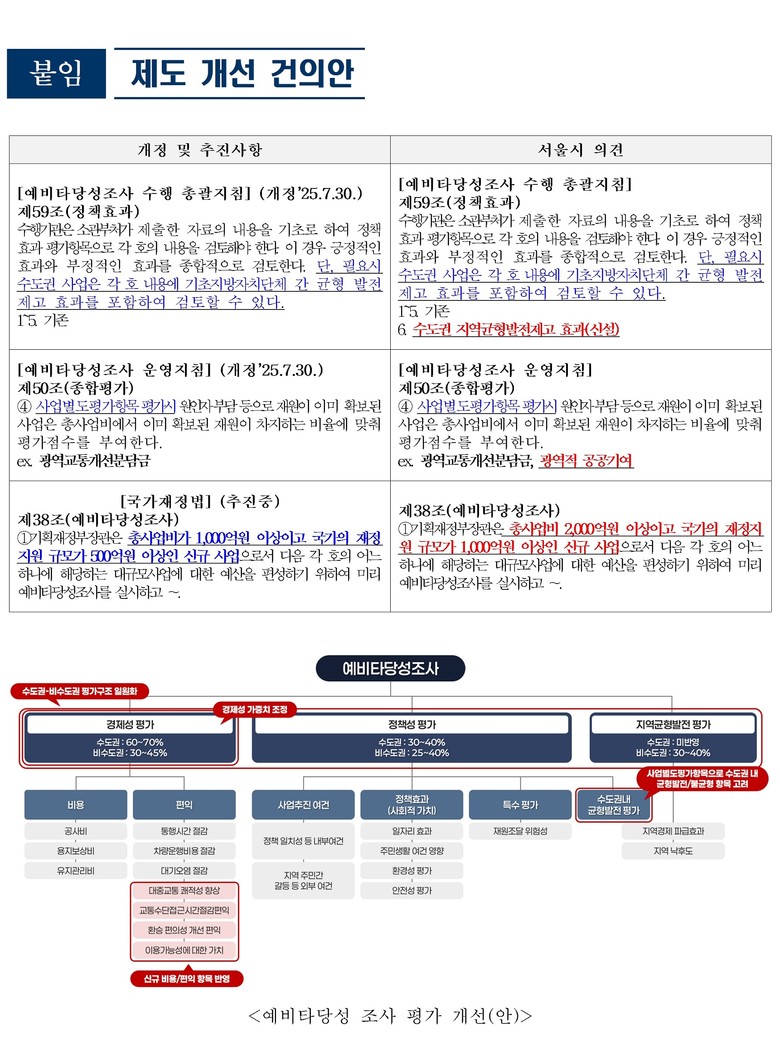 서울시는 기재부에 예비타당성 총괄지침 제59조(정책효과)를 개정해 수도권 내 균형발전제고 효과를 정책성 평가의 별도 항목으로 반영하고, 구체적인 적용 방식과 평가 점수 기준을 명확히 마련해 줄 것을 건의했다.