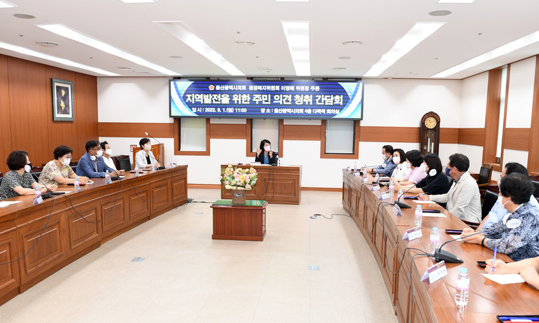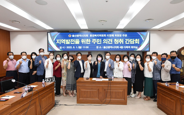 [울산 세계타임즈=이호근 기자] 울산시의회 이영해 환경복지위원장은 8월 1일 오전 11시, 시의회 4층 다목적회의실에서 대현동, 선암동 주민들과 ‘지역발전을 위한 주민 의견 청취 간담회’를 가졌다.