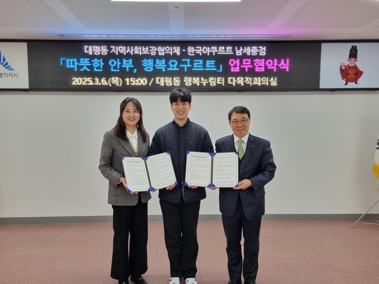 [세종 세계타임즈=이채봉 기자] 세종특별자치시 대평동지역사회보장협의체(공동위원장 강옥주·이재익)가 6일 한국야쿠르트 남세종점(점장 김대영)과 ‘따뜻한 안부, 행복 요구르트’ 사업 추진을 위한 업무협약을 체결했다.