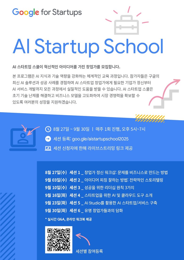 참가 신청은 AI 스타트업에 관심 있는 도민이면 누구나 가능하며, https://goo.gle/aistartupschool2025 또는 포스터 내 QR코드를 통해 참가 등록을 할 수 있다.