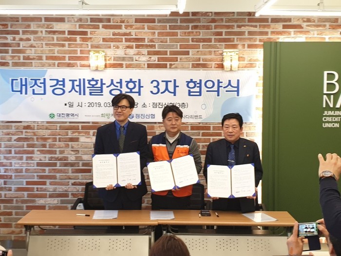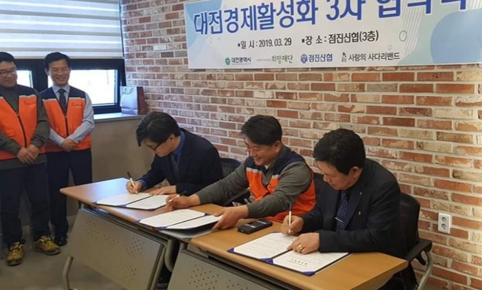 [세계타임즈 이장성 기자] SNS 대전시 봉사단체 (사)사랑의 사다리 밴드는 29일 오전11시 점진신협 3층에서 대전소상공인 살려 이웃사랑을 함께 실천하기 위해서 점진신협(이사장 신현학), (재)중소상공인희망재단(이사장 이윤재)과 대전경제활성화를 위한 3자 업무협약(MOU)을 체결했다.
